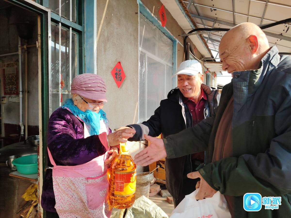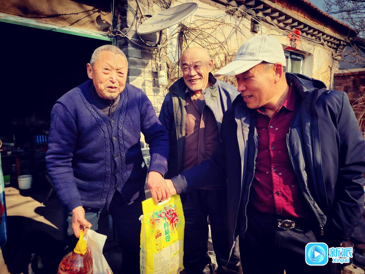 周福春(中)代表兒子給村里老人送年貨。
