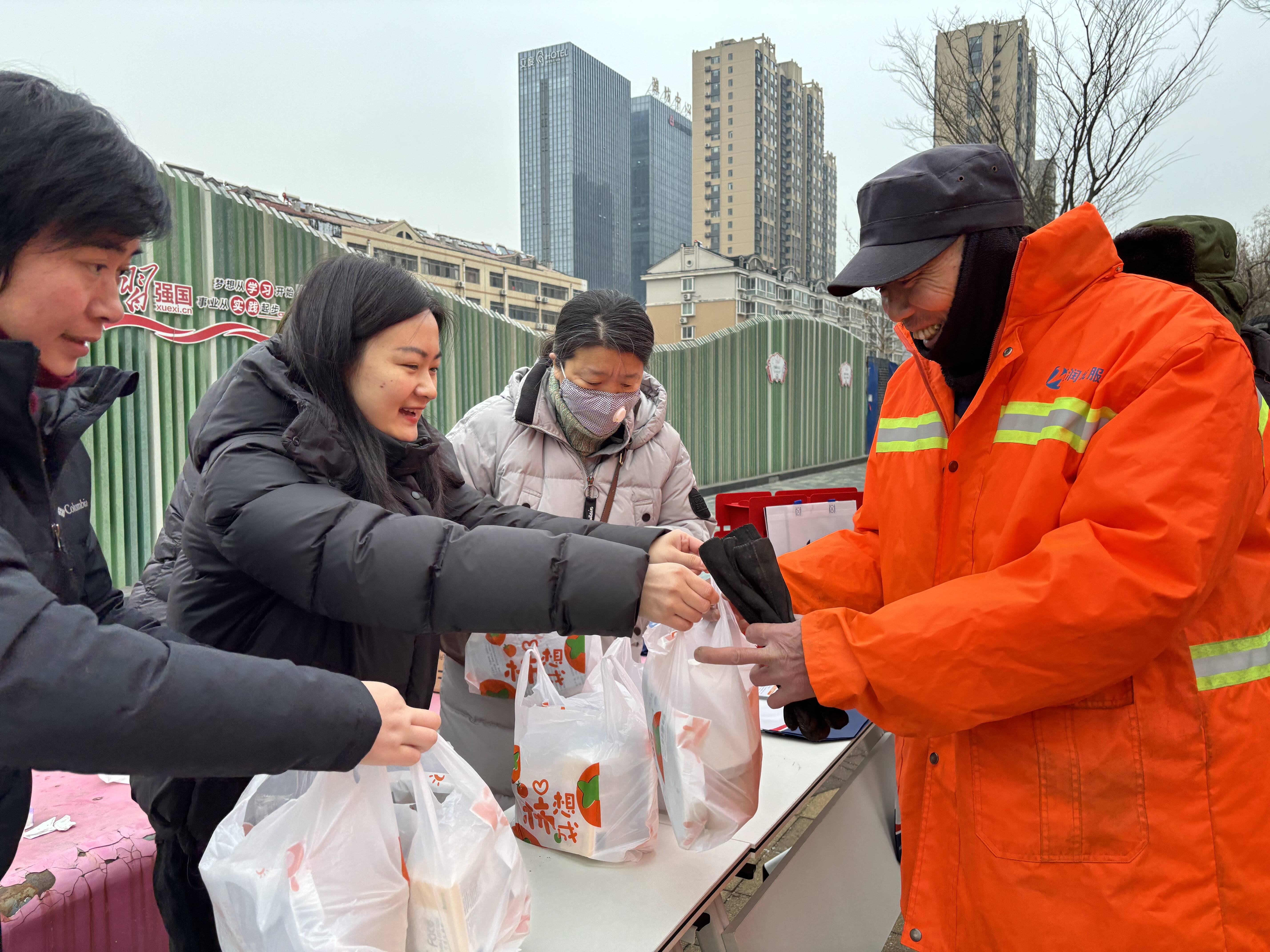 活動現(xiàn)場,分行志愿者們與環(huán)衛(wèi)工人親切交談,詳細(xì)詢問日常作業(yè)強(qiáng)度與冬季防寒情況,對他們不畏嚴(yán)寒、默默守護(hù)城市潔凈的奉獻(xiàn)精神致以誠摯敬意。